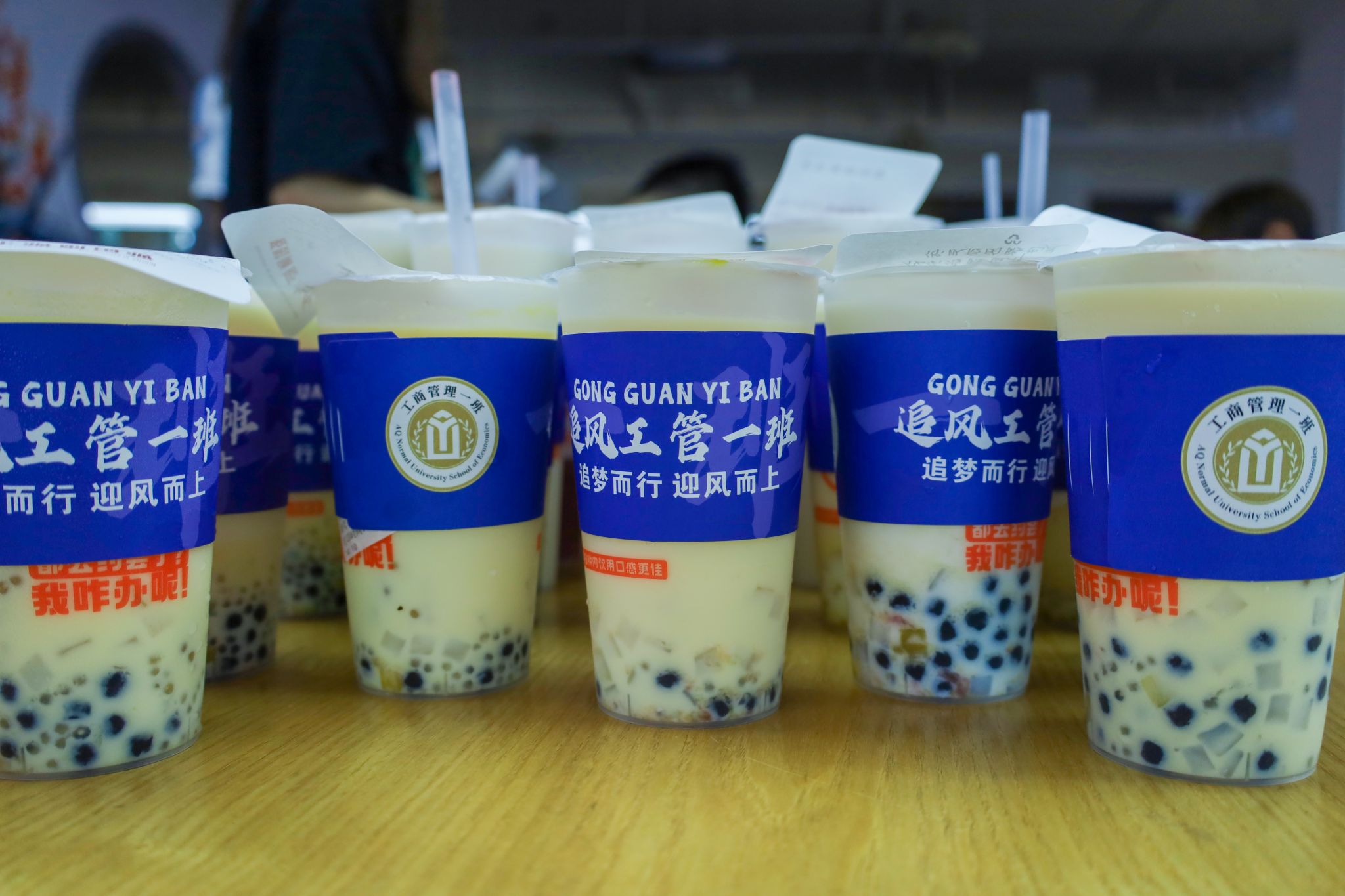 早在活动开展前,活动负责人肖雨欣同学便定制了特色杯套和同学们提前写下的暖心寄语,待奶茶制作结束贴在杯口处,同学们可以交换制作的奶茶,相互鼓励,也可以把奶茶送给校园里工作的叔叔阿姨。