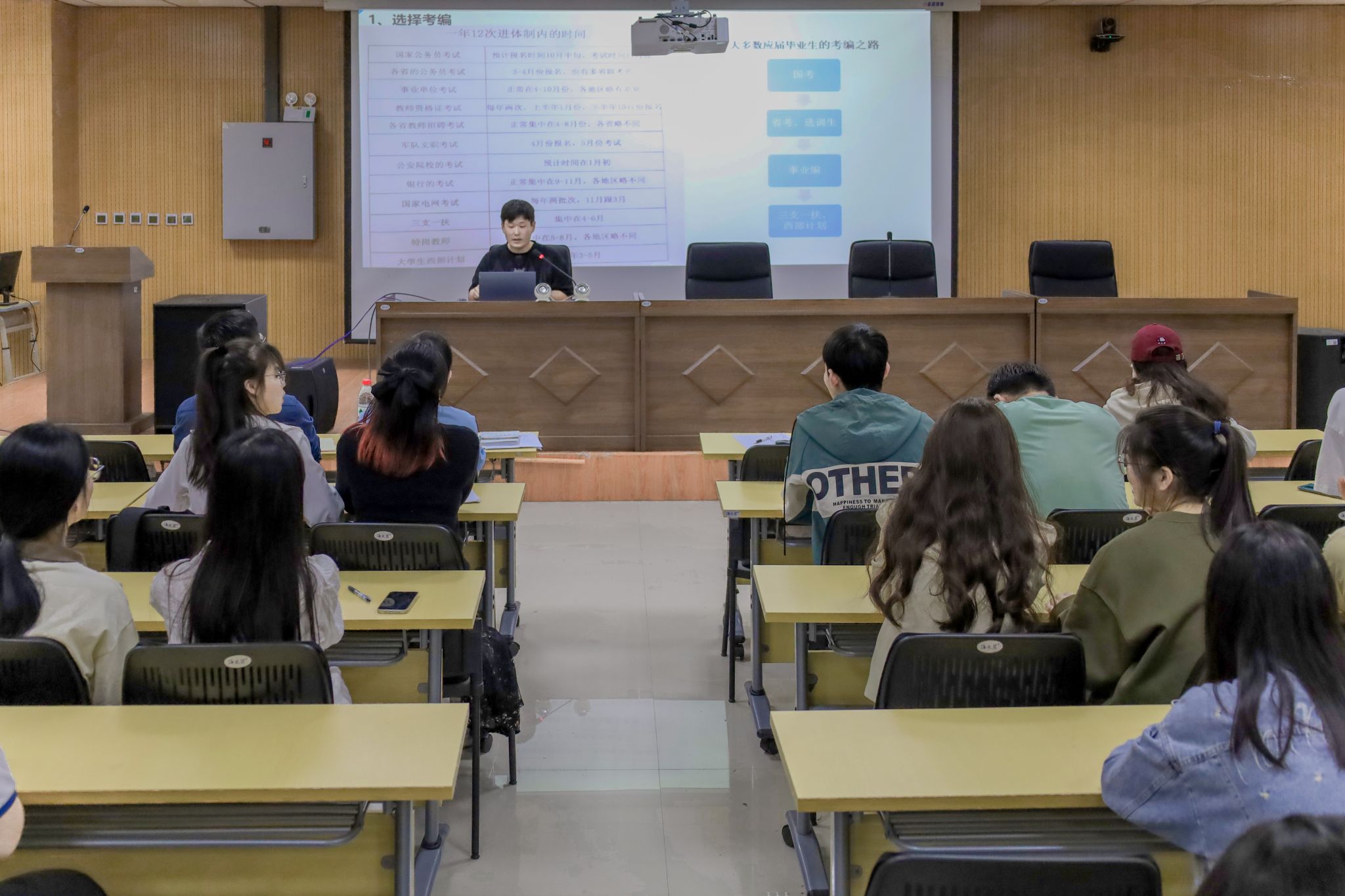 5月23日,九游体育官网在M楼112报告厅举办“抉择未来,把握人生”考研、考公及就业经验分享交流会。学院6名毕业生结合自身考学与求职的经历分享经验,辅导员老师张敏、吴臻和学院160余名学生参与分享会。