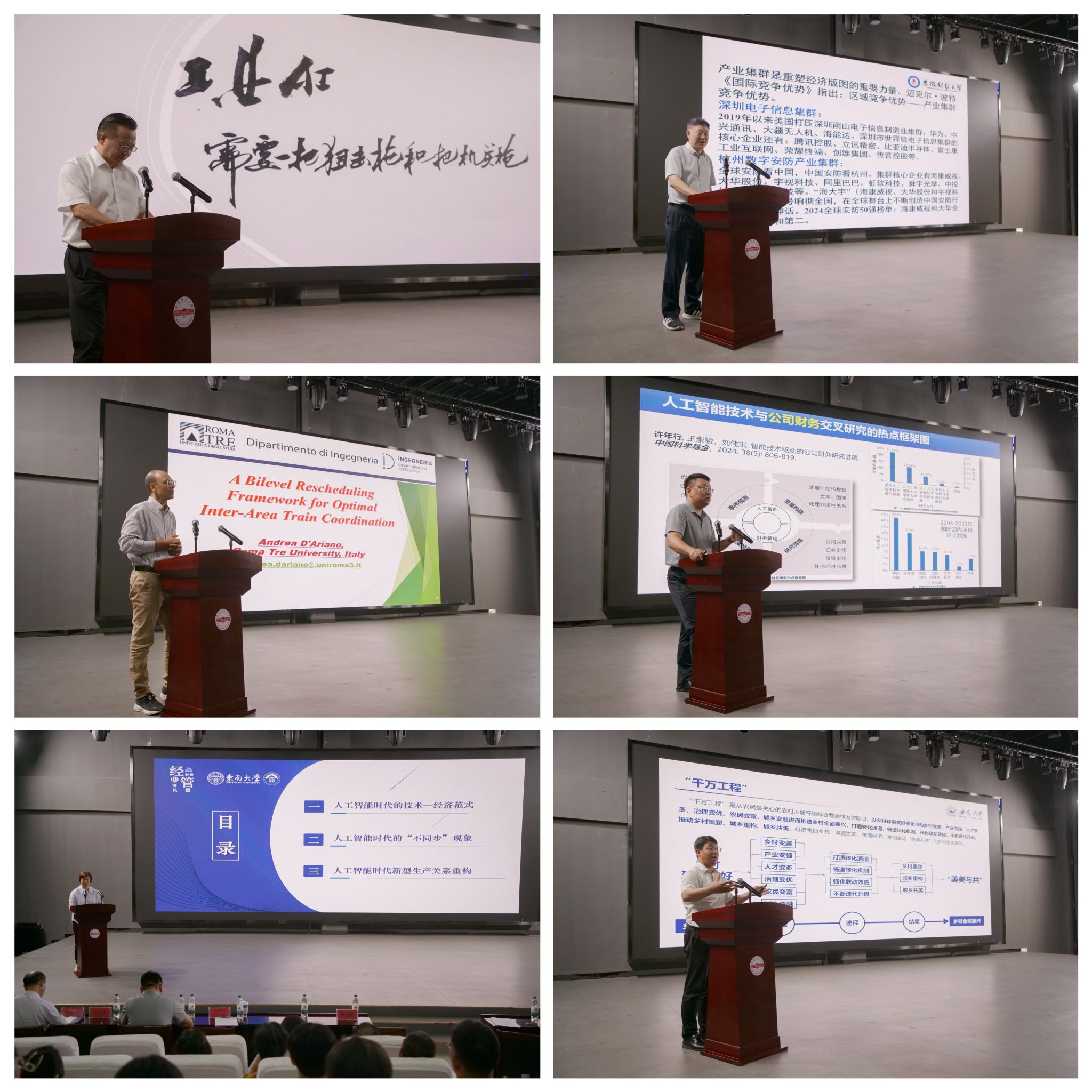 大会主论坛上,安徽省工业和信息化厅二级巡视员潘峰、安徽财经大学原副校长冯德连教授、上海外国语大学马宝君教授、罗马第三大学Andrea D'Ariano教授、东南大学国家发展与政策研究院理事长袁健红教授、安徽大学中国乡村振兴研究院院长崔宝玉教授分别作题为《工业AI需要一把狙击枪和一把机关枪》、《长三角培育世界级先进制造业集群的优势与路径》、《人工智能方法赋能商科学术研究探索:以企业社会责任报告分析研究为例》、《一种实现最优区域间列车协调的双层调度框架》、《人工智能时代的新型生产关系探索》、《安徽省践行“千万工程”—成效、挑战与路径》的主旨报告。校学术委员会副主任、九游体育官网杨国才教授主持论坛会议。