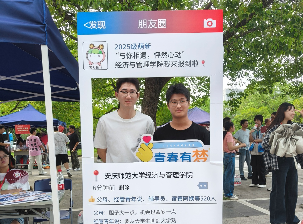 报到现场,学院打造的“微信朋友圈”主题展板格外吸睛,展板底部缀满仿真点赞与留言元素,成为新生合影的热门打卡点。“今天正式报到,这样的迎新设计特别温馨!”来自合肥市的新生陈翔笑着说。萌新们脸上洋溢着灿烂笑容,眼中满是对大学生活的憧憬,纷纷在此定格“九游体育官网首张照片”,珍藏入学首日的难忘瞬间。