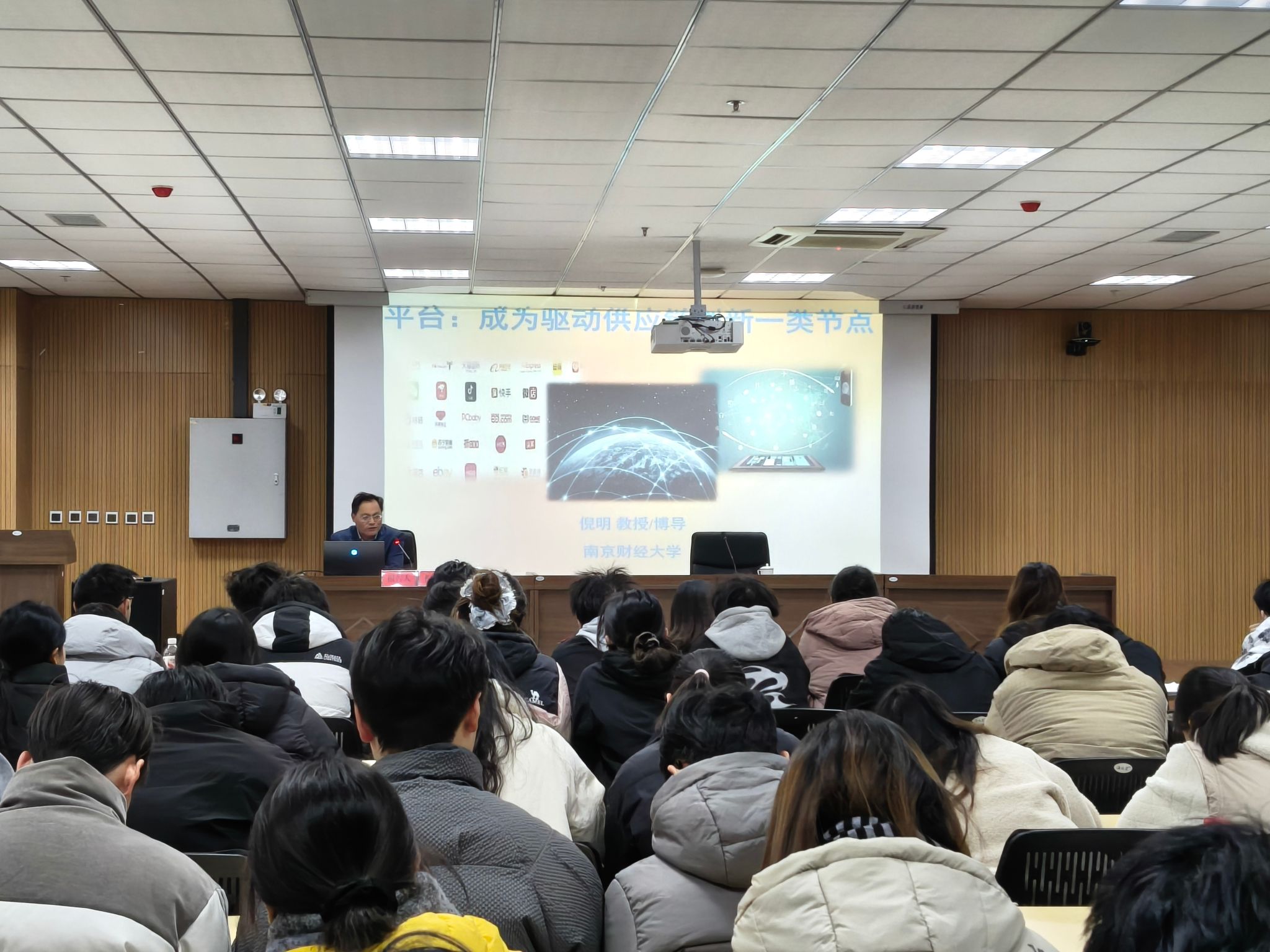 在交流环节,倪明教授就平台赋能传统供应链、小微企业如何借助平台实现价值突破、大模型在供应链预测与治理中的可能性等问题,与现场师生进行了互动讨论。他鼓励学生关注平台经济演化趋势,加强对供应链创新的跨学科研究思考。(撰稿:徐洋;供图:罗雪纯;审核:徐俊杰)
