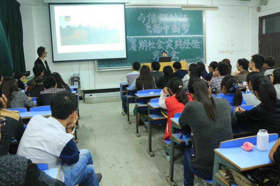 随后,7名社会实践代表依次通过PPT展示暑期实践活动,其讲述的社会实践经验涵盖寻访、调研、就业、创业、志愿活动。12级财务管理专业的刘安安同学,以走进小岗村实践调研的实践经历赢得关注。担任省运会志愿者的朱振文和叶露露认为“团队的沟通交流与合作的至关重要”。说起这段志愿者经历,他们微笑着说,“既然做就要做到最好,你只有真正付出才懂得其间真谛”。