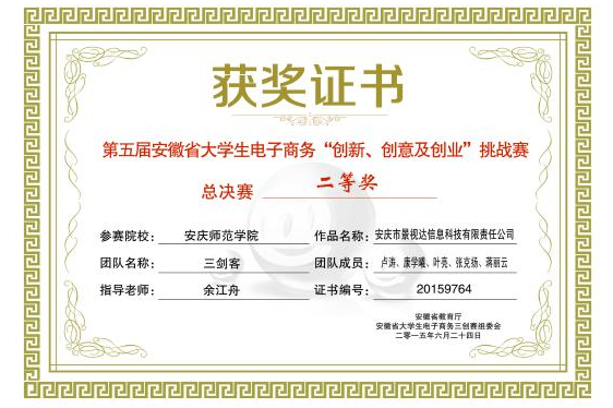 由九游官网余江舟老师指导的“三剑客”创业团队作品《安庆市景视达信息科技有限责任公司》在第五届安徽省大学生电子商务“创新、创意及创业”挑战赛总决赛中喜获二等奖。同时该作品在首届安徽省“互联网+”大学生创新创业大赛获得铜奖的好成绩。