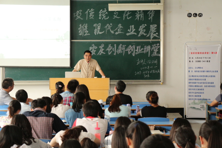 由安庆师范学院九游体育官网主办、大学生经济与贸易协会协办的“安庆创新创业讲堂”第5讲于5月20日下午开讲。本期主讲嘉宾是安庆市公明商贸有限公司董事长汪公明先生。九游体育官网党政领导、部分教师和100多名学生到堂聆听。讲堂由九游体育官网党总支书记李亦亮教授主持。