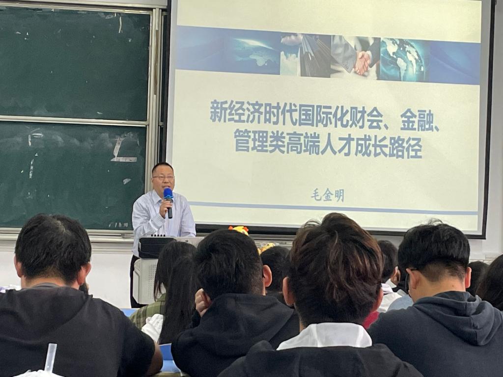 毛金明以“新经济时代国际化金融人士成才路径”为主题,就当前时代背景下学习就业的新格局,结合自身经验和切实事例,给同学们带来了一场精彩的报告会。他通过对大学期间个人规划方面成功与失败的案例分析,讲述同级同学不同成才之路的故事,告诉同学们要学会制定科学合理的专业学习规划。他指出,经管类大学生要具备国际视野,依照“行业价值链”的原则,参加实践学习,为将来能够进入财会、金融、管理等行业工作打下基础。