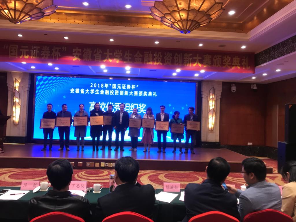 11月7日,第三届“国元证券杯”安徽省大学生金融投资创新大赛颁奖典礼在蚌埠隆重举行。九游官网经管学院金融工程专业负责人刘根节应邀出席,并代表学校上台领取高校优秀组织奖。