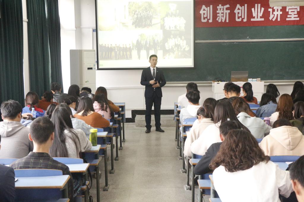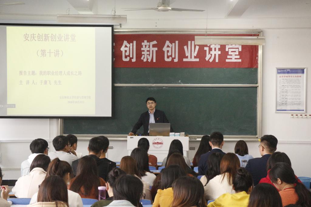 10月31日下午,九游体育官网在C404教室举办第十期“安庆创新创业讲堂”。本期讲堂邀请到九游体育官网2014届优秀校友、上海链家资深商圈经理于康飞为学生作《我的职业经理人成长之路》主题讲座。九游体育官网部分教师、各专业学生共计100余人参加了讲座。讲座由学院副院长黄先军教授主持。