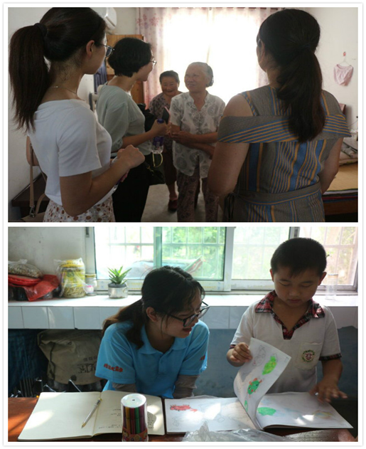 尊老爱幼是中华民族的传统美德,实践服务团将关爱孤寡老人和留守儿童作为此次实践活动重点关爱的对象。在凉亭乡敬老院住着五十多位老人,他们大多是五保、低保户,实践服务团的队员们带着慰问品来到敬老院,与老人们一起拉家常,倾听老人们的往事,询问老人们的身体状况,将温情传递给缺少陪伴而感到孤独的老人们。在留守儿童较为聚集的鹤林村,队员们带着文具大礼包走进了留守儿童之家。队员们给孩子们送上文具,陪孩子们谈心,和孩子们一起做游戏,并进行一对一的作业辅导。与孩子们的近距离接触,队员们感受到这些留守儿童因缺少父母的陪伴而更加渴望被别人的关爱,并计划在后期能组建志愿者开展下村支教活动。