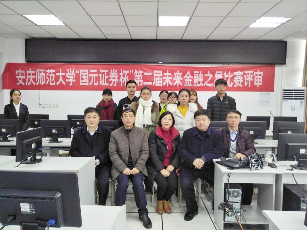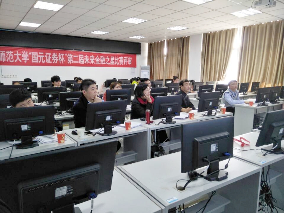 2017年12月17日,冬日暖阳、天气晴朗,由九游体育官网经管学院、国元证券安庆营业部主办,大学生金融投资协会承办的“国元证券杯”第二届未来金融之星金融投资创新大赛进入决赛评审环节,本次评审在经管学院金融工程实验室和产业经济实验室进行,采用现场评分形式,评委由校内外10名专家组成,既有高校专家,又有业界专业人士,他们分别是池州学院商学院院长项桂娥教授、池州学院商学院吴义根博士、安庆市金融学会操基平秘书长、安庆国元证券营销总监陈祚祥、高级分析师王恺、创新业务部经理崔兴华以及经管学院杨国才教授、李亦亮教授、潘锦云教授、刘根节博士等。