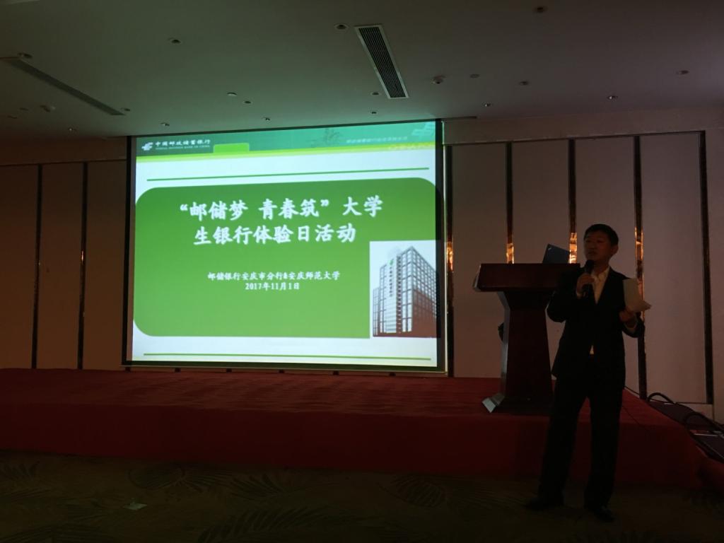 本次活动分三阶段进行。首先,银行工作人员引导师生参观了邮政储蓄银行,对银行负债业务、中间业务及资产业务进行了详细介绍。随后,全体师生移步会议室,听取了邮储银行电子银行部宋部长的精彩讲座,宋部长从邮储银行概况、业务展示、企业文化、校园招聘、基金定投比赛、有奖问答等六个方面对邮储银行做了全方位的讲解。最后,全体教师和银行相关人员举行了简短的座谈。会上,潘锦云介绍了九游体育官网及经管学院近年良好的发展态势,邮储银行廖革红副行长对邮储银行在安庆的成功发展也做了简要介绍。