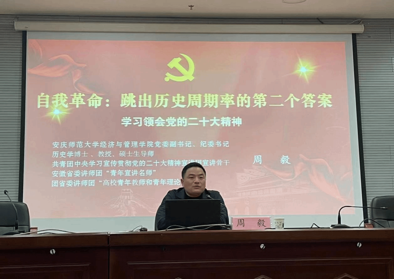 周毅作为安徽省委讲师团“青年宣讲名师”、团省委讲师团“高校青年教师和青年理论专家”,于2022年11月入选共青团中央“学习宣传贯彻党的二十大精神宣讲骨干培训班”,先后为学校、国有企业等各企事业单位开展党的二十大精神主题宣讲多次。(撰稿:陈路;摄影:孙栎简;审核:许俊杰)