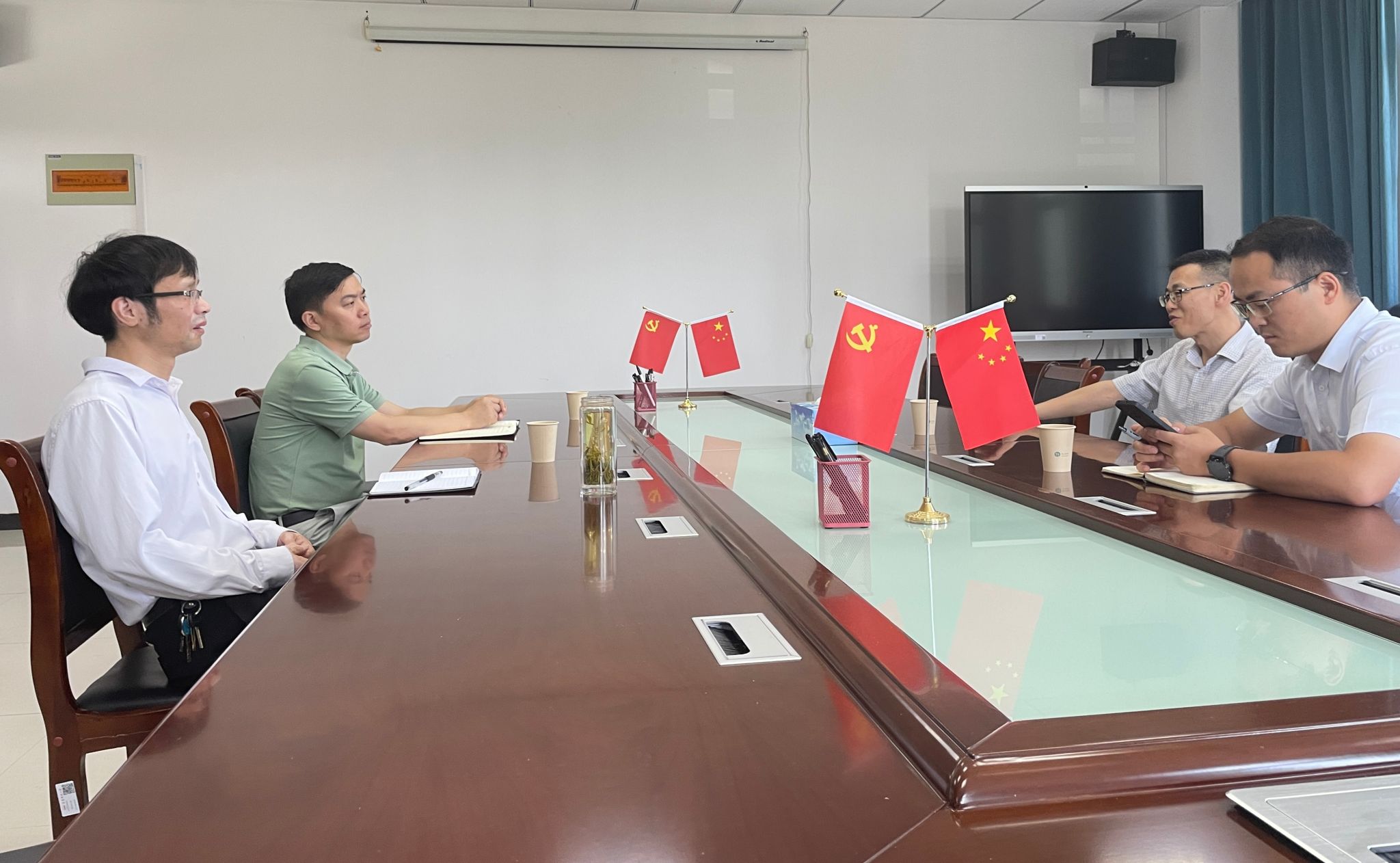 7月11日上午,中国人寿财产保险股份有限公司安庆市中心支公司副总经理冯高军、综合管理部经理张兵来九游体育官网交流校企合作事宜。九游体育官网党委书记许俊杰、副院长徐俊杰、就业秘书参与交流。