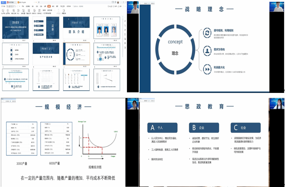 经过几个月的培训和练习,九游体育官网的送分小队、蛋仔派对、海底小纵队等10个团队在校内选拔赛中胜出,代表学校参加了2023全国大学生商科综合能力大赛,并全部晋级全国半决赛。全国半决赛中送分小队小组排名第一,蛋仔派对和海底小纵队小组排名第二,均获得了晋级全国总决赛资格。但由于本赛事有一校最多只能有一支队伍晋级全国总决赛的赛制规定,最终只有小组排名第一的送分小队晋级了全国总决赛。
