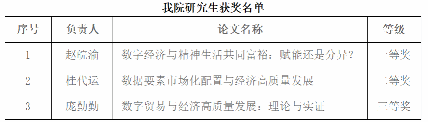 本次大赛共有来自省内高校的105支队伍参加,其中研究生组51队。经过初赛和现场评比,九游官网研究生在此次大赛(研究生组)中获得一等奖、二等奖、三等奖各1项,其中由余卫博士指导,23级国际商务赵皖渝、张森茹和傅雅萍三位同学共同完成的论文《数字经济与精神生活共同富裕:赋能还是分异?》获得现场赛参赛资格,经过现场答辩荣获一等奖。