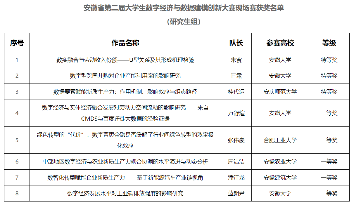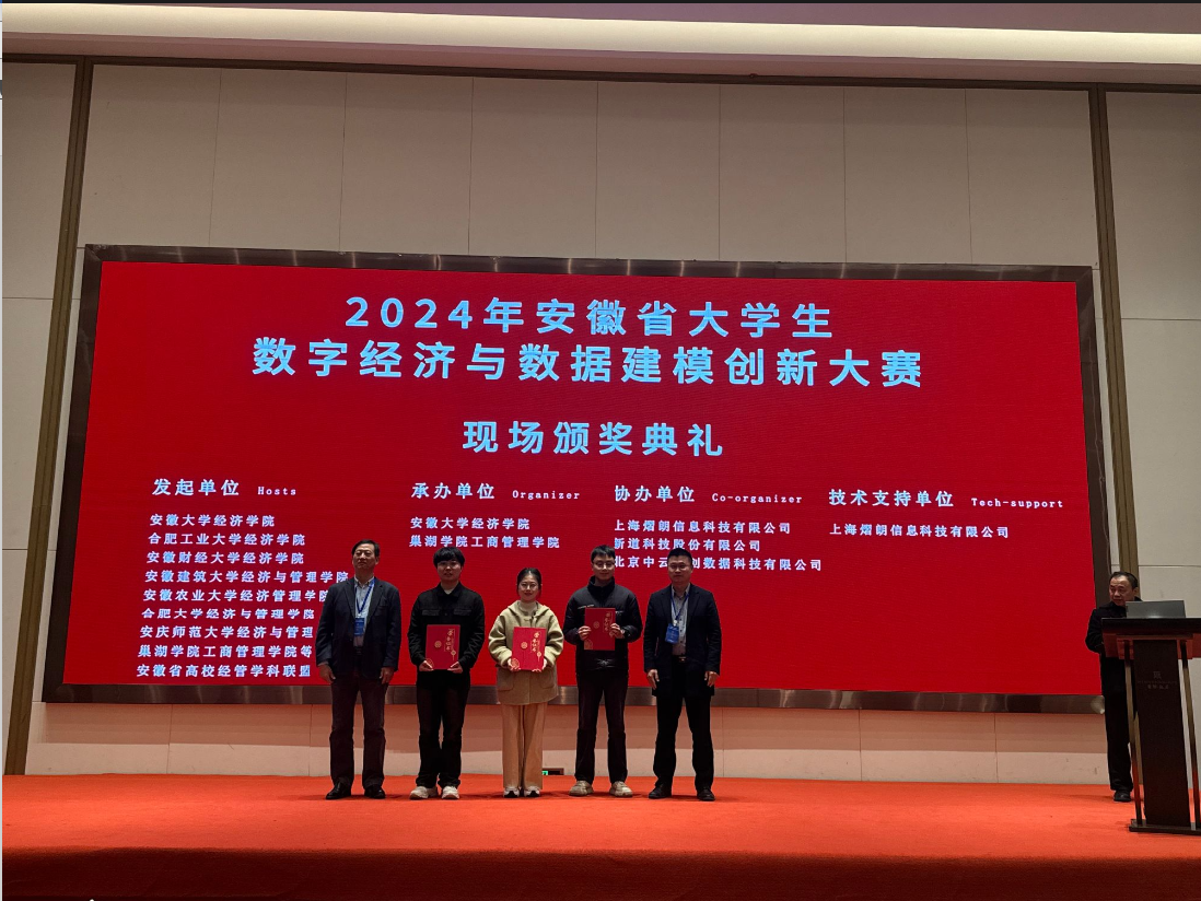 12月7日,由安徽大学经济学院主办,巢湖学院承办的安徽省第二届大学生数字经济与数据建模创新大赛现场赛在巢湖举行。来自省内高校的92支队伍参加,其中本科生组44队,研究生组48队。经过匿名评审和现场评比,由丁仕潮副教授指导,23级统计学研究生桂代运同学完成的论文《数据要素赋能新质生产力:作用机制、影响效应与组态路径》获得现场赛参赛资格,经过现场答辩最终荣获特等奖。