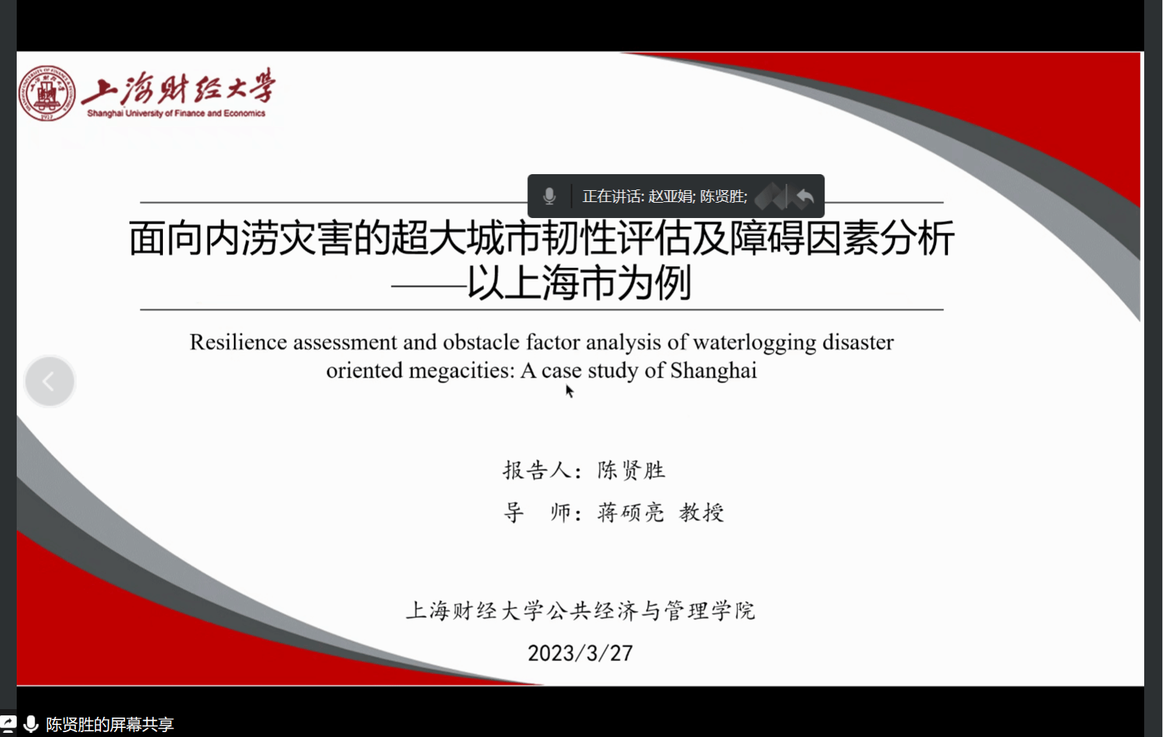 4月6日晚上,由学院打造的研究生学术交流平台“优博讲坛”第7期开讲,来自上海财经大学的陈贤胜博士在线分享了题为《面向内涝灾害的特大型城市韧性评估及障碍因素分析——以上海市为例》的学术报告,全体统计学研究生、本科生及部分老师参加了交流活动,讲坛由赵亚娟老师主持。