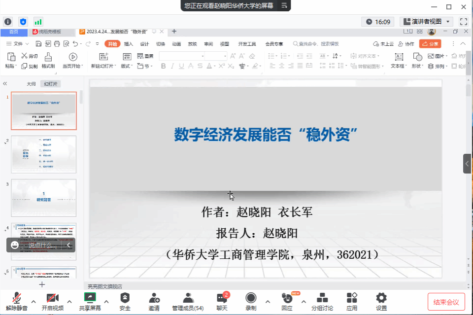 4月24日晚上,由九游体育官网、区域经济与城乡发展研究所联合主办的研究生学术交流平台“优博讲坛”第8期开讲,来自华侨大学的赵晓阳博士在线分享了题为《数字经济发展能否“稳外资”》的学术报告,全体统计学研究生、本科生及部分老师参加了交流活动,讲坛由彭长生教授主持。