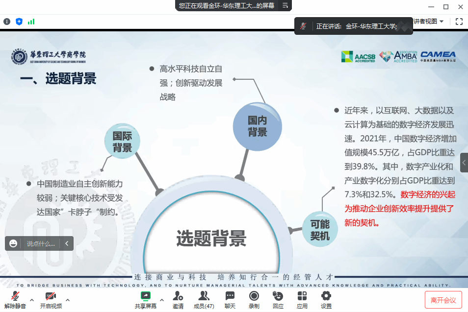 报告人简介:金环,华东理工大学产业经济学专业博士研究生,主要研究领域为数字经济与环境经济。学术论文方面,在财贸经济、经济学家、中国人口资源环境、经济评论、科研管理、产业经济研究、南方经济、科技进步与对策、现代财经(天津财经大学学报)、Frontiers in Psychology等期刊发表论文。课题方面,参与2项国家社会科学基金项目。