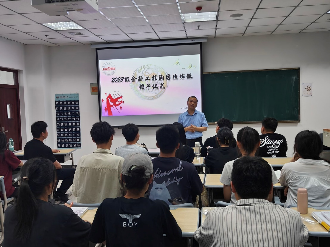 6月12日,2023级金融工程陶因班班徽授予仪式在经管楼顺利召开,会议由金融工程专业负责人储平平主持,陶因班班主任杨国才、辅导员陈路参加了班徽授予仪式。