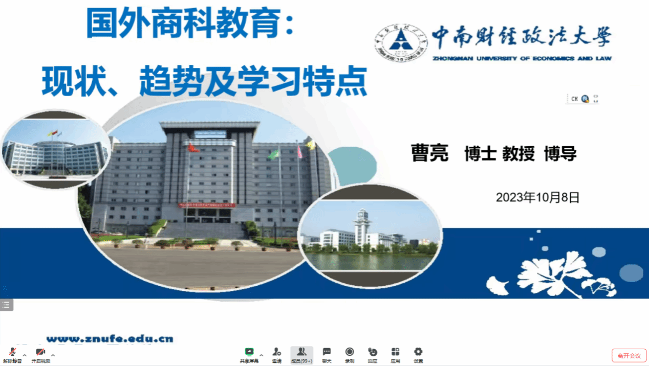 10月8日,由九游体育官网科研处、九游体育官网联合主办,九游体育官网数字经济研究中心承办的“经管有道”第3期开讲。中南财经政法大学曹亮教授受九游官网邀请,通过线上方式分享了题为“国外商科教育:现状、趋势及学习特点”的学术报告。硕士生导师、青年教师、研究生及相关专业本科生共100余人参加了交流活动,报告会由殷功利副教授主持。