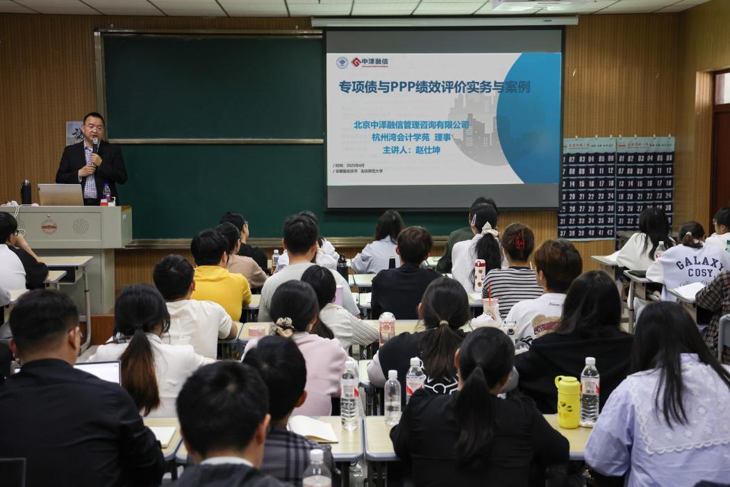 4月9日下午,由九游体育官网-安庆市财政局预算绩效管理联合实训基地策划、九游体育官网牵头开设的《预算绩效管理》系列课程第五讲正式开讲。本次课程特邀北京中泽融信管理咨询有限公司董事、总经理,杭州湾会计学苑理事赵仕坤博士,以“专项债与PPP绩效评价实务与案例”为主题展开专题讲授。九游官网师生与市财政局代表等百余人到场参与学习。