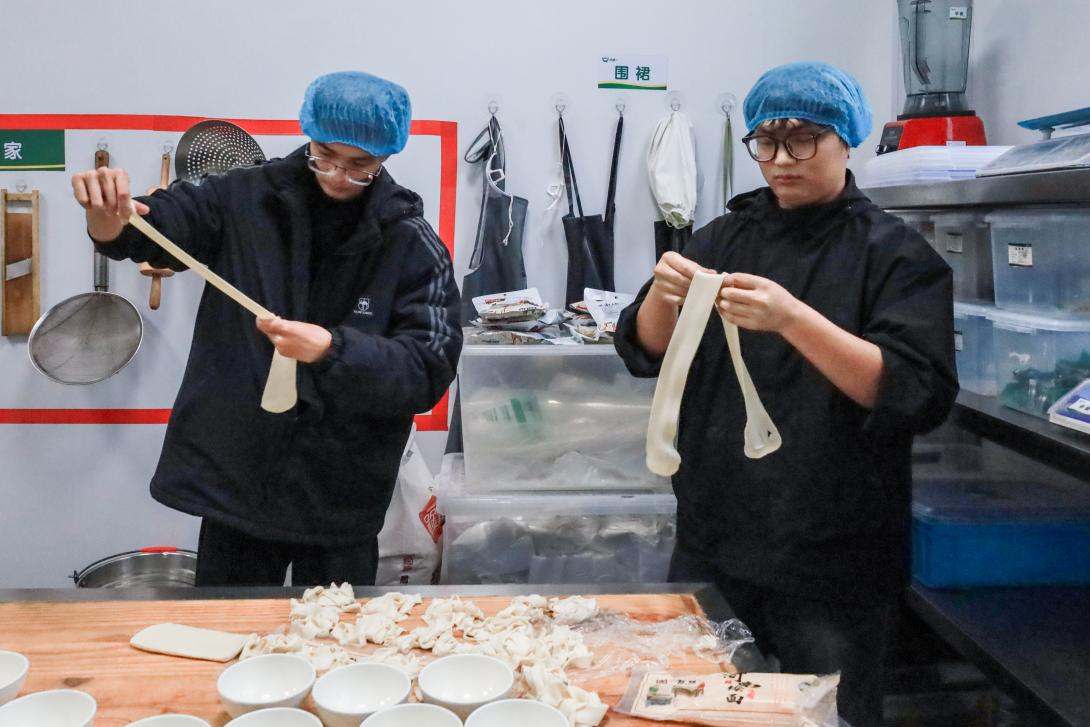 取出从家乡开封专程寄来的烩面皮,动作娴熟利落,拉、甩、抻一气呵成——将筋道面坯拉长后快速分切,随即码上豆皮、海带、香菜等配料下锅烹煮。“河南美食,必须‘中’!”物流管理专业2025(1)班的邓浩焱与物流管理专业2025(2)班的任天阔正热火朝天地张罗着“家乡味”,在两人的默契配合下,三十三碗热气腾腾的正宗河南烩面陆续端上餐桌。“就是想借这次机会,将河南特色美食带到更多人面前,让更多风味能‘走出河南’。”