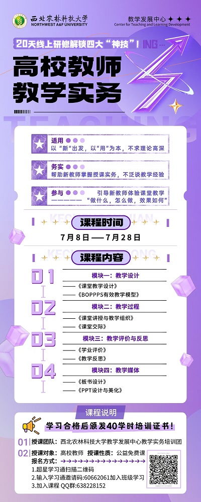 完成并达到培训要求的教师,将获得西北农林科技大学颁发的培训证书。教师发展与服务中心将给予继续教育学时的认定。