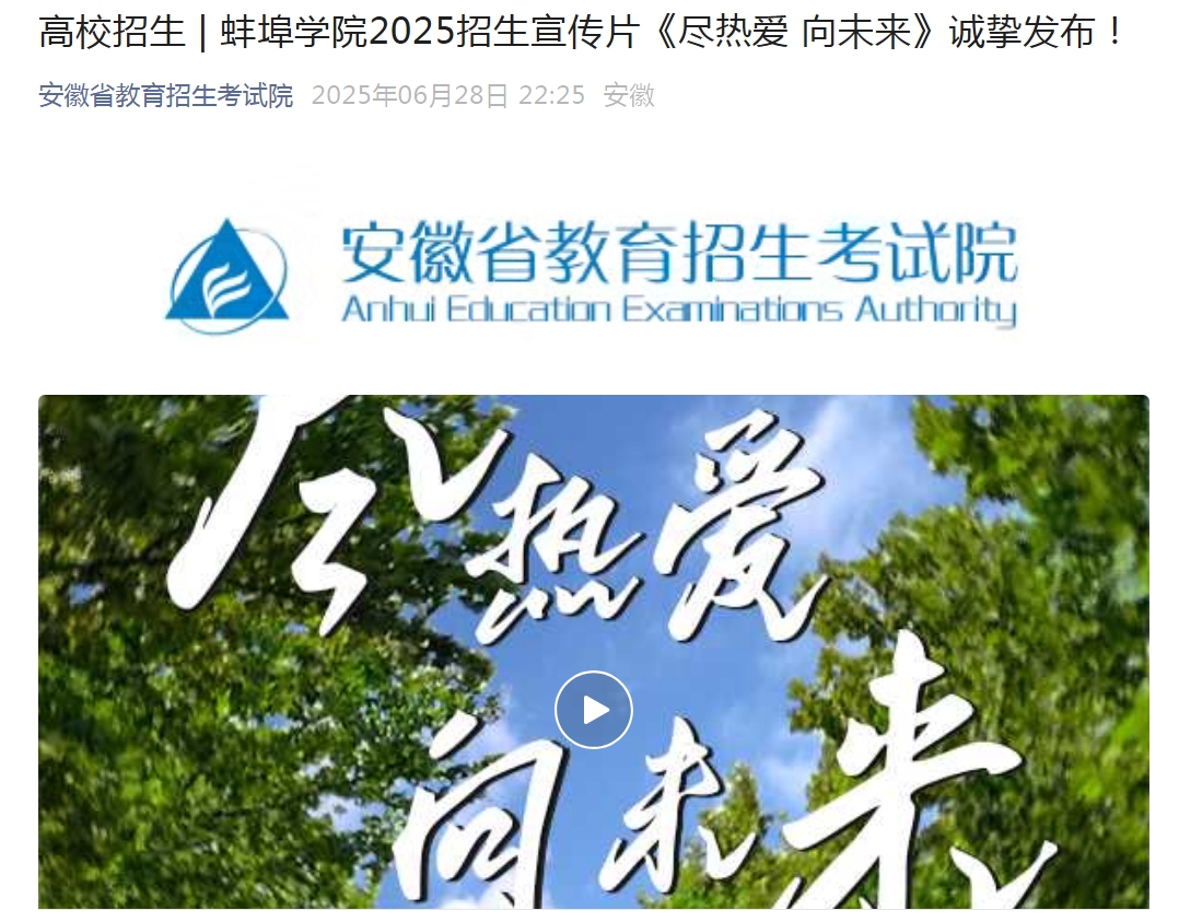 【安徽省教育招生考试院】高校招生 | beat365在线体育官网登录入口2025招生宣传片《尽热爱 向未来》诚挚发布!
