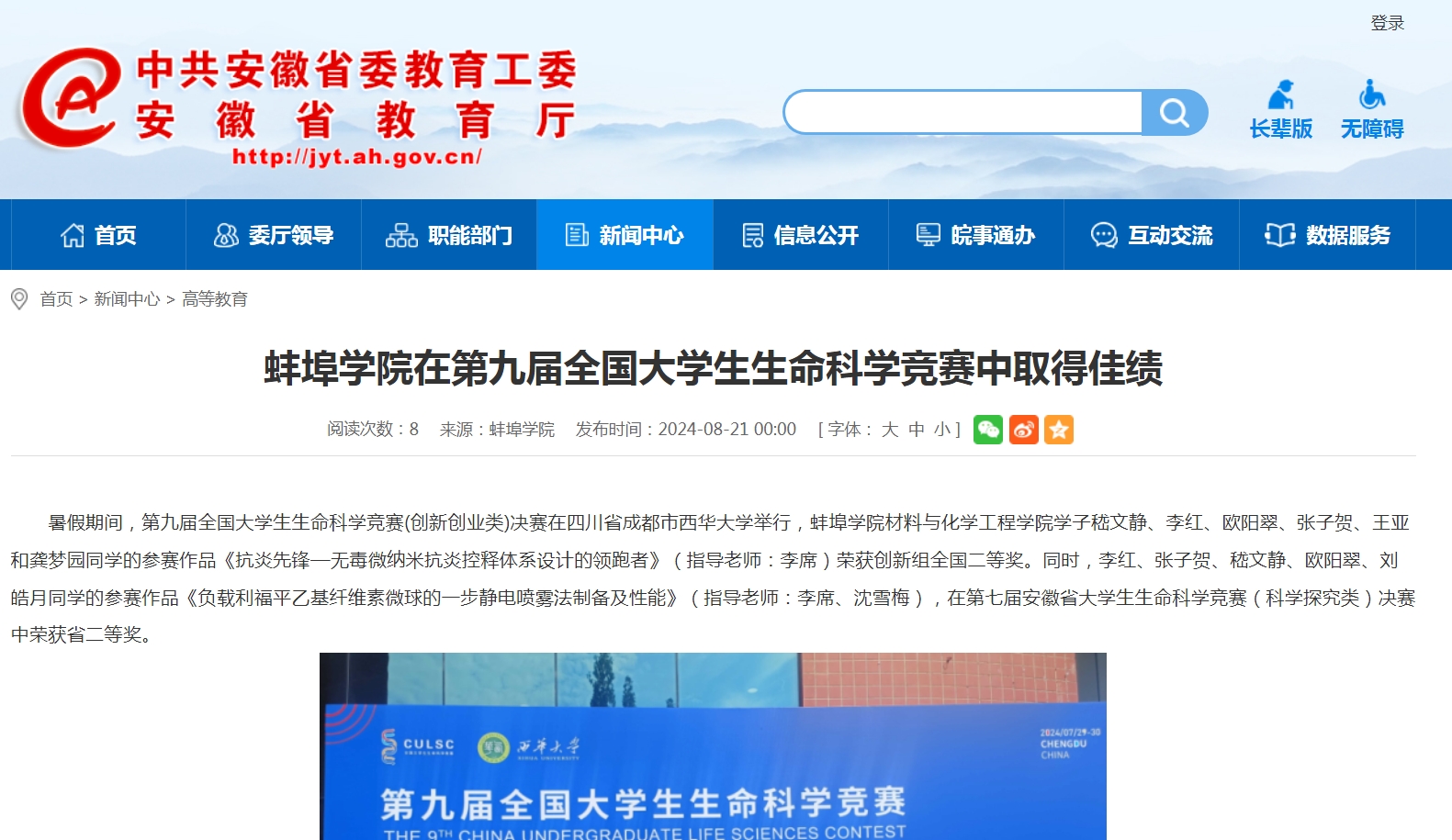 【安徽省教育厅】beat365在线体育官网登录入口在第九届全国大学生生命科学竞赛中取得佳绩