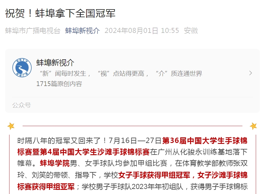 【蚌埠广电】祝贺!蚌埠拿下全国冠军