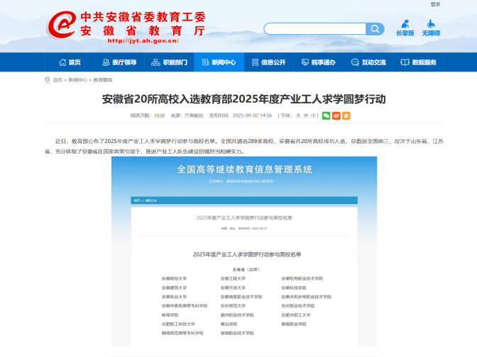 近日,教育部公布2025年度产业工人求学圆梦行动参与高校名单。全国共遴选289家高校,beat365成功入选,充分体现了beat365在国家政策引领下,推进产业工人队伍建设的强担当和硬实力。此次行动是贯彻落实《教育强国建设规划纲要(2024-2035年)》《中华全国总工会 教育部 人力资源社会保障部 中华全国工商业联合会关于广泛开展实施求学圆梦行动 推进产业工人学历与能力提升的意见》的重要举措,未来将为安徽省产业转型升级和经济高质量发展注入强大动力。