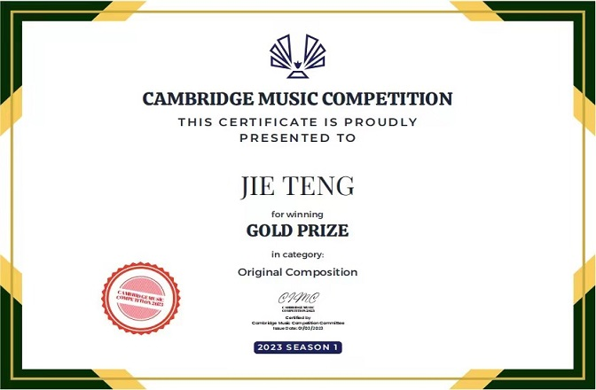 日前,音乐与舞蹈学院优秀毕业生滕杰在剑桥音乐大赛中获得作曲金奖。本次比赛有来自22个国家或地区的420名选手参加。
