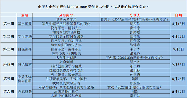 在追逐梦想的征途中,榜样的力量是无穷的。为发挥电子与电气工程学院优秀学生的榜样作用,促进学院学生确立清晰的学习目标,以激励全体学子追求卓越、实现超越,学院计划于4月18日启动2023-2024学年第二学期“TA是我的榜样分享会”。