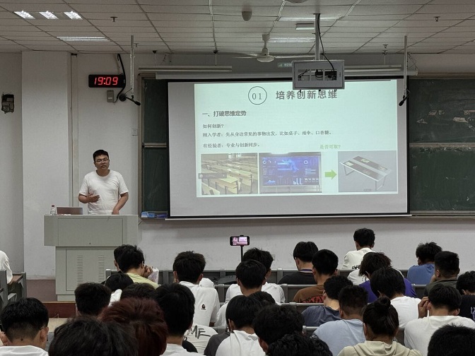 在分享中,王创伟以自己的亲身经历为范例,鼓励同学们要敢于追寻内心的梦想,勇于挑战自我极限,不断开拓创新,实现自我超越。在交流中,他详细阐述了自己是如何从参赛项目中发掘创新的闪光点,并将其成功转化为具有实际应用价值的创业项目。他坦诚分享了比赛过程中遇到的种种挑战与困境,以及自己如何化解这些困难,最终取得了优异的成绩。最后他坚信,只要同学们付出真挚的努力和坚持,就一定能够在未来的学习和生活中创造更加辉煌的成绩,收获更加丰富的人生体验。