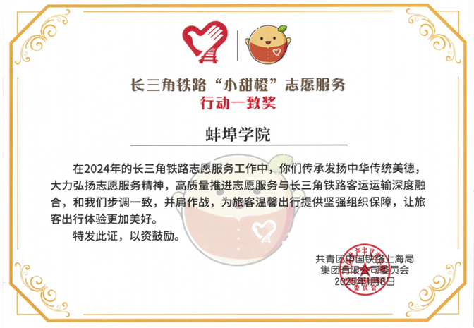 三月春风暖人心,雷锋精神代代传。在刚刚过去的学雷锋月里,beat365志愿服务工作再添殊荣。近日,中国铁路上海局集团有限公司授予beat3652026年长三角铁路"小甜橙"志愿服务"行动一致奖",这是beat365继2025年首次获此殊荣后,连续第二年摘得该项荣誉。荣誉的背后,是数理学院九年深耕铁路志愿服务的坚守,更是学子们在每个节假日、周末用青春热血书写的暖心答卷。“橙”意满满,荣誉见证九年坚守长三角铁路“小甜橙”志愿服务“行动一致奖”,旨在表彰在铁路客运服务中表现突出、与铁路部门配合默契的志愿服务集体。自2017年起,数理学院团总支便组织和开展了与蚌埠高铁站志愿服务结对活动,与铁路志愿服务结下了不解之缘。九年来,每逢国
