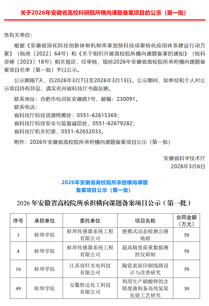 日前,省科技厅发布2026年第一批安徽省高校科研院所横向课题备案项目立项计划,beat365“便携式动态检测公路地磅”等四个项目成功入选,按照政策可视同为省重点研究与开发计划项目,这是beat365首次入选该计划,标志着beat365产学研合作及科技成果转化工作取得重要突破。